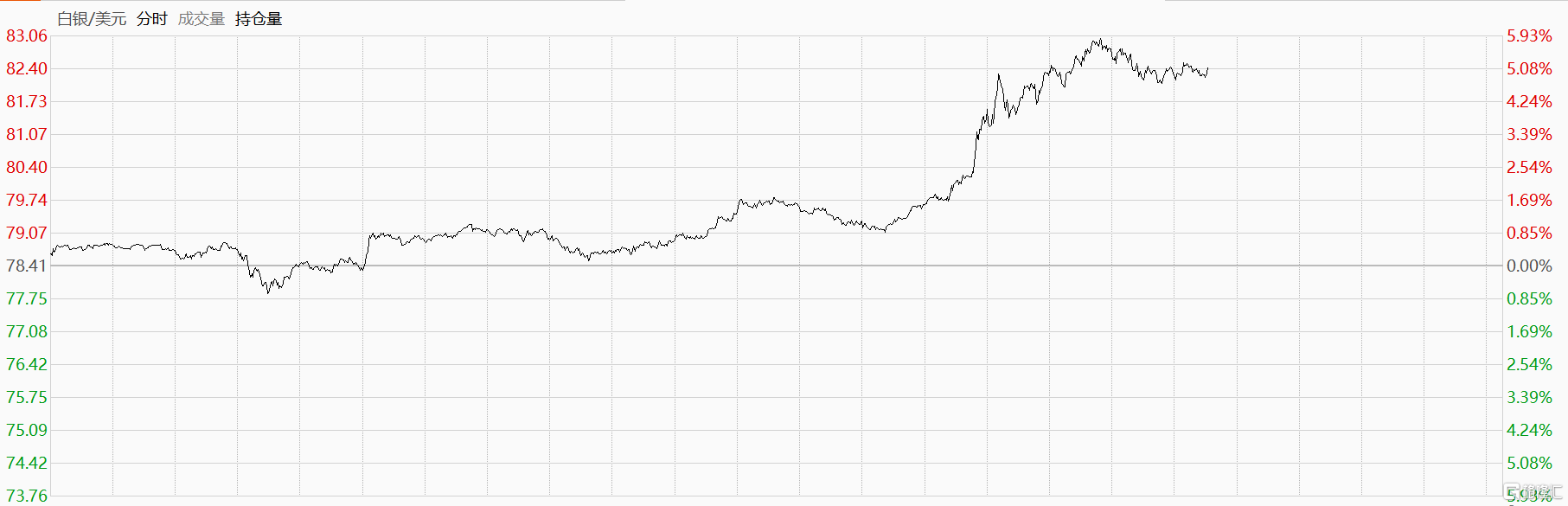 黄金、白银价格飙升。现货黄金涨1.58%至4866.71美元/盎司;白银涨势更猛,现货价格飙涨近5%,报82.31美元/盎司。
