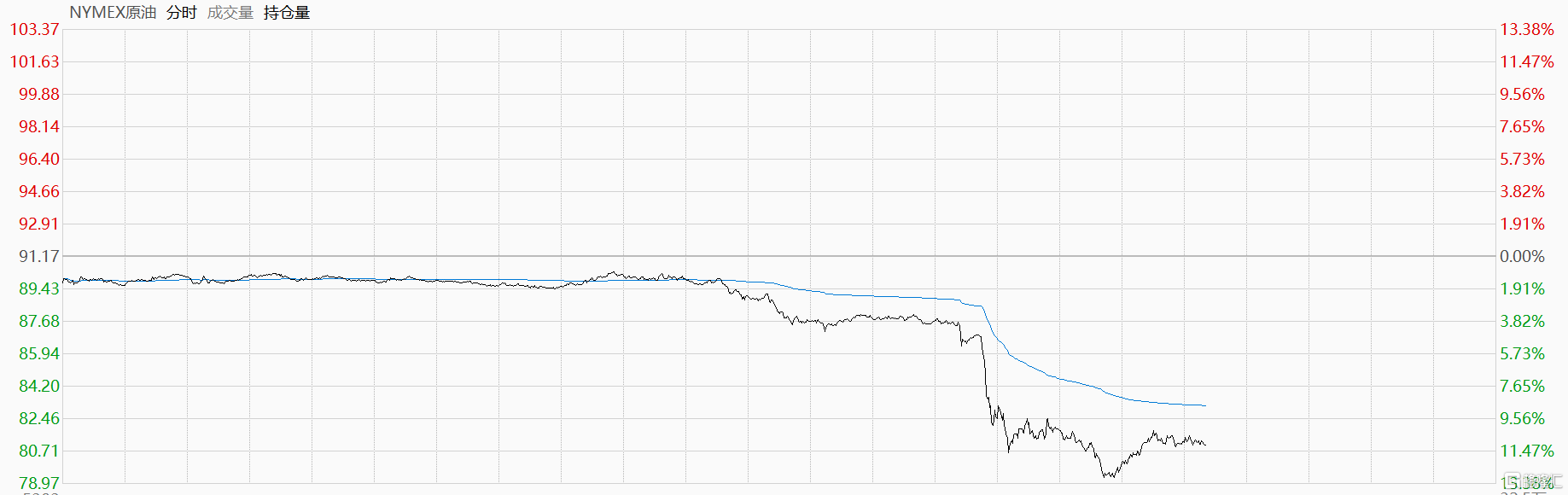 WTI原油期货暴跌超11%,报81.09美元/桶;布伦特原油跌超10%,报88.91美元/桶。