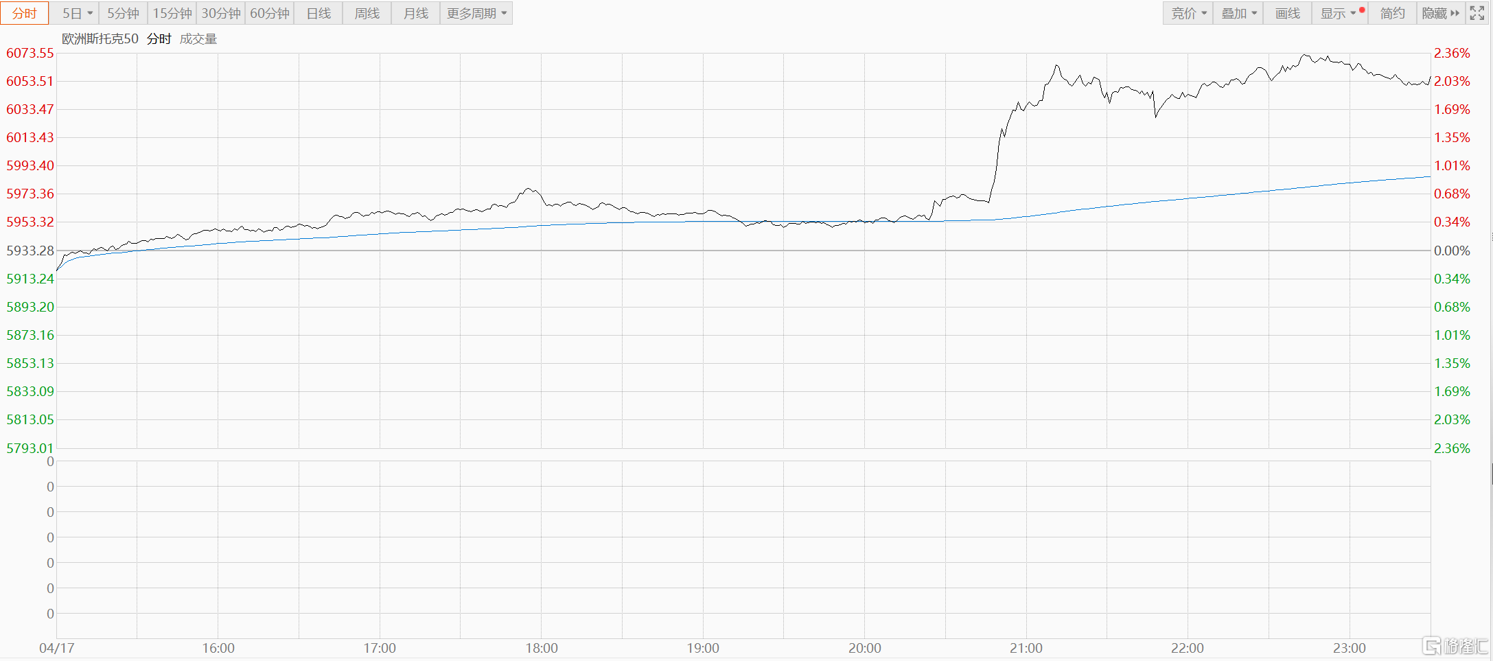 欧洲股市集体大涨,欧洲斯托克50指数涨超2%,德国DAX30指数涨2.25%,法国CAC40指数涨1.97%,英国富时100指数涨0.73%。